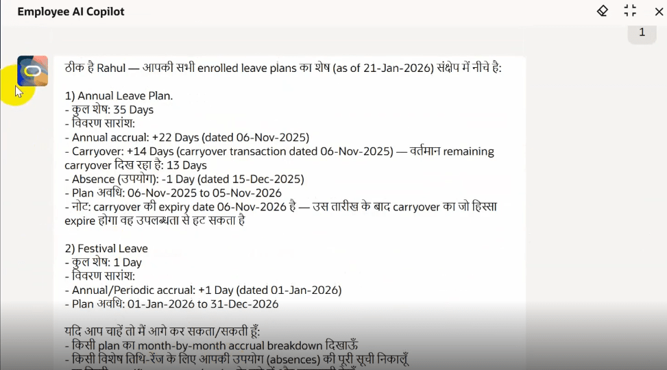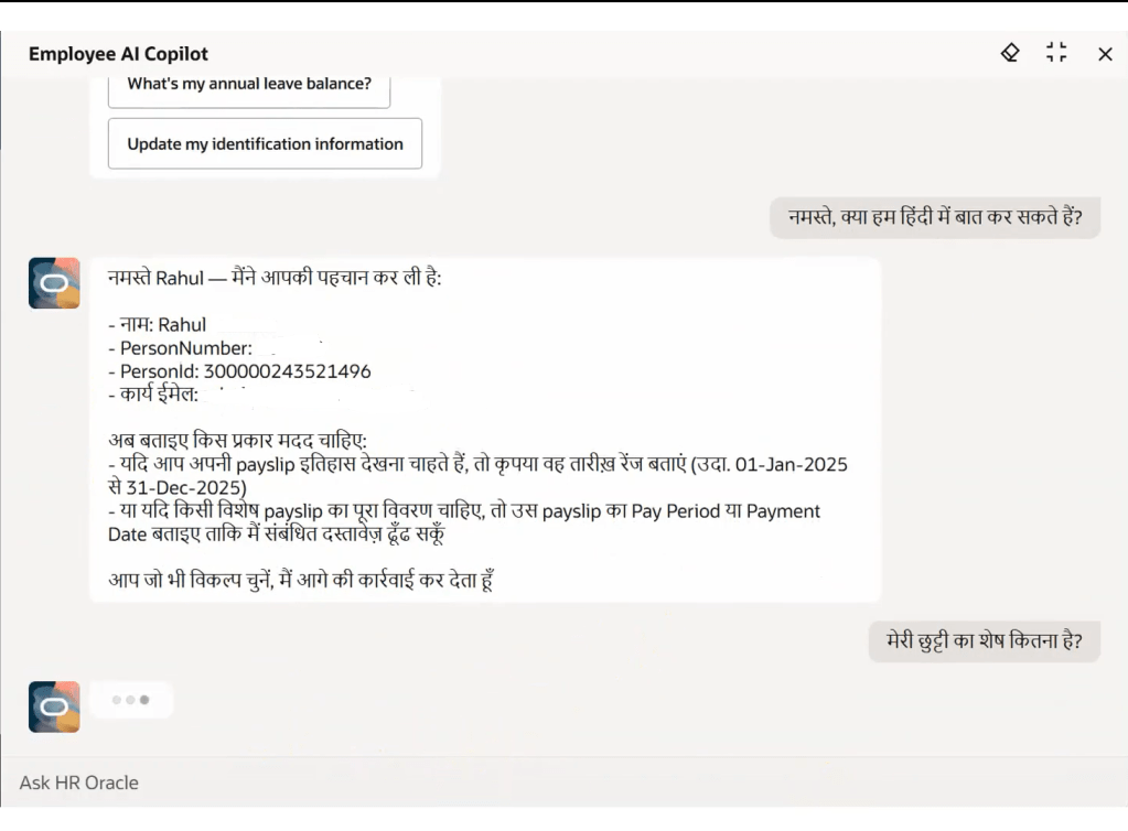 One of the coolest features of this agent is that it’s multilingual and will keep evolving with every quarterly release. In our global work environment, not everyone wants to discuss their complex benefits or pay discrepancies in English. The Concierge can interpret and respond in multiple languages, ensuring that every employee—regardless of where they are in the world—gets the same high-level support and clarity. I have tried it in Hindi, Marathi, Telugu etc.